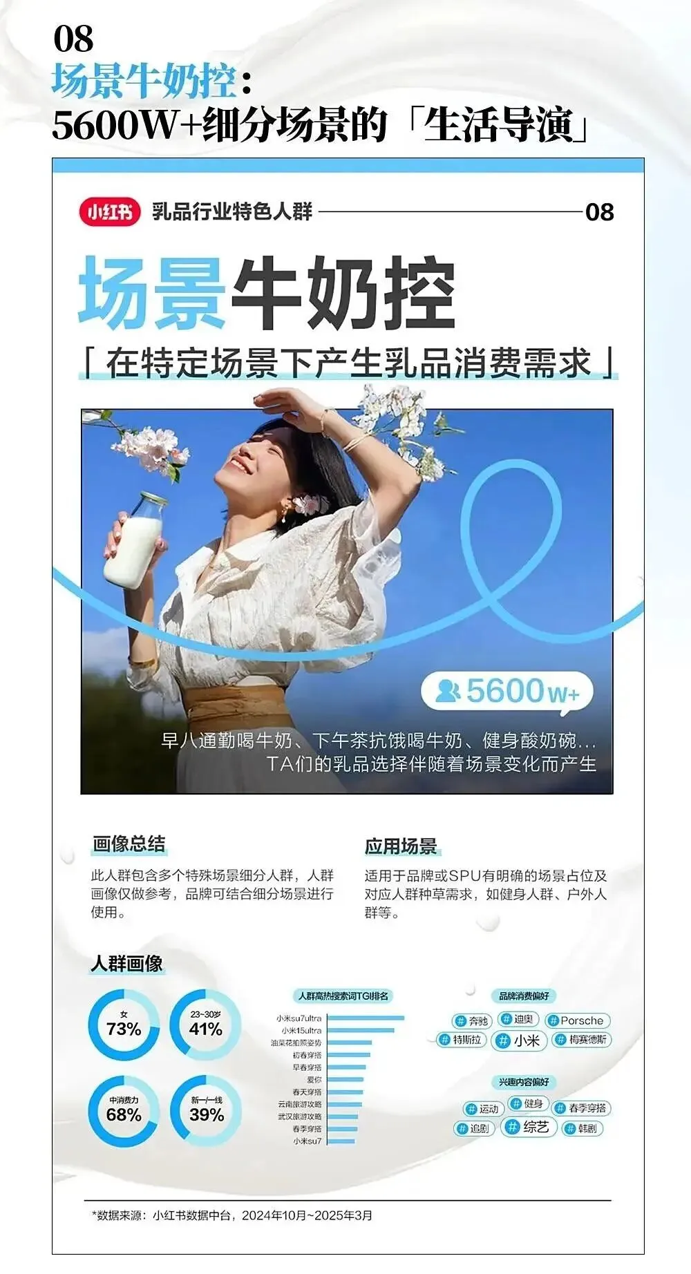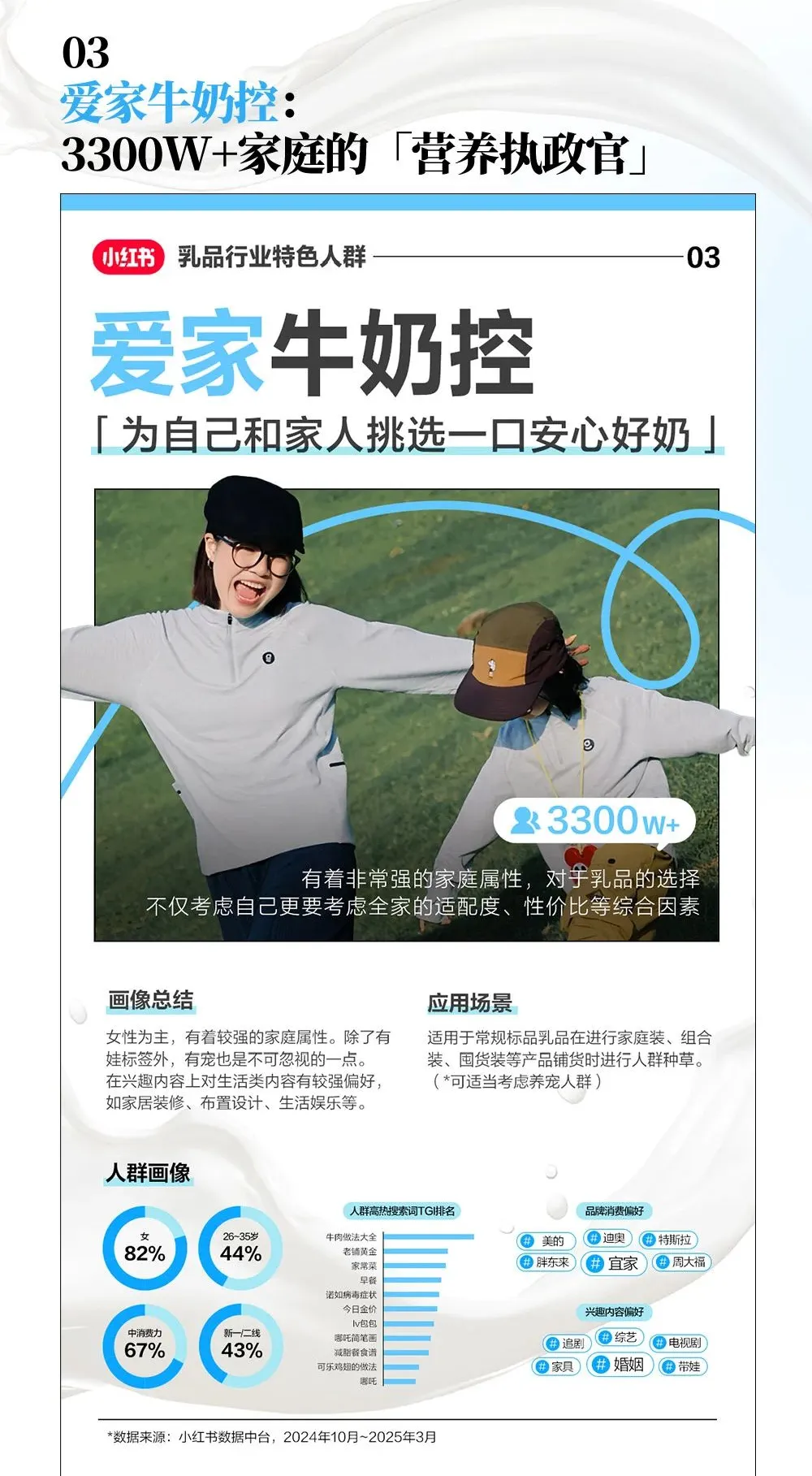 对乳品行业而言,小红书正在成为洞察消费趋势的核心阵地:从职场妈妈的快手早餐需求,到健身人群的蛋白补给,再到年轻家庭的儿童营养关注,不同消费群体通过真实分享构建起多元场景图谱。同时,通过后文拆解行业八类特色人群的底层消费驱动,品牌可精准捕捉早餐轻食、运动恢复等细分场景中的差异化用户需求,将精细需求转化为产品创新、渠道布局、营销升级等增量拓展新方向,实现从市场响应到需求引领等多维进阶。