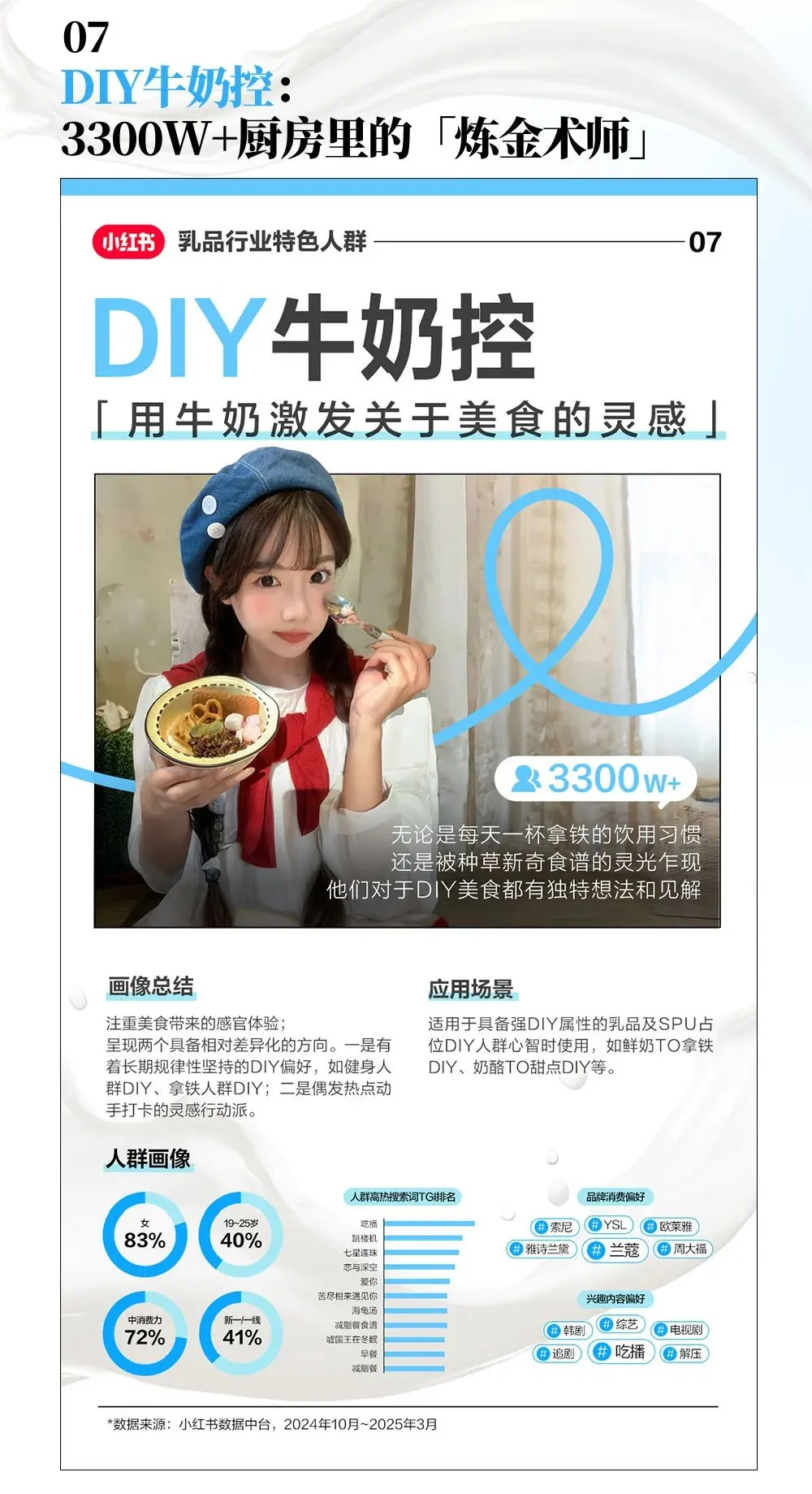 DIY牛奶控们都是厨房里的创意天才,小红书上,她们分享食谱教程,让更多人解锁牛奶的神仙喝法,引领潮流新趋势乳品更像是这类用户的“乐高积木”--喝掉的是液体,拼出来的是「你看我能玩转生活」的人设。