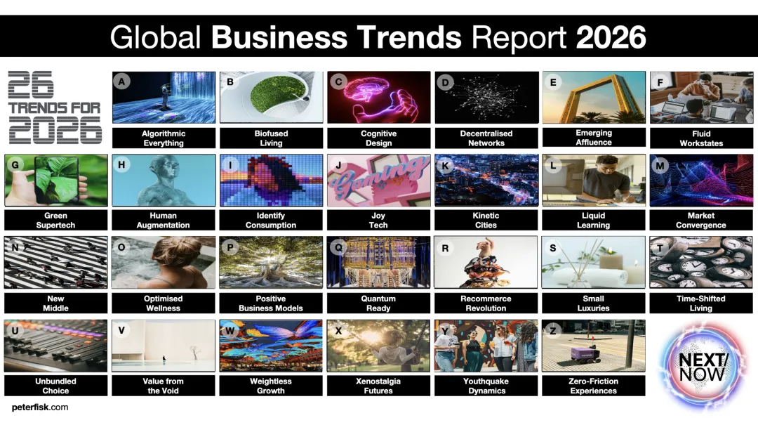 知名商业思想家Peter Fisk发布的《26个趋势:2026年全球商业趋势报告》指出,2026年将是技术与人文深度碰撞、商业本质被重塑的关键年份。报告梳理了26个关键趋势,解析2026年将如何成为商业重大转变的转折点。未来企业必须在技术加速、文化转型与可持续挑战并存的复杂环境中,重新思考价值创造与增长逻辑。