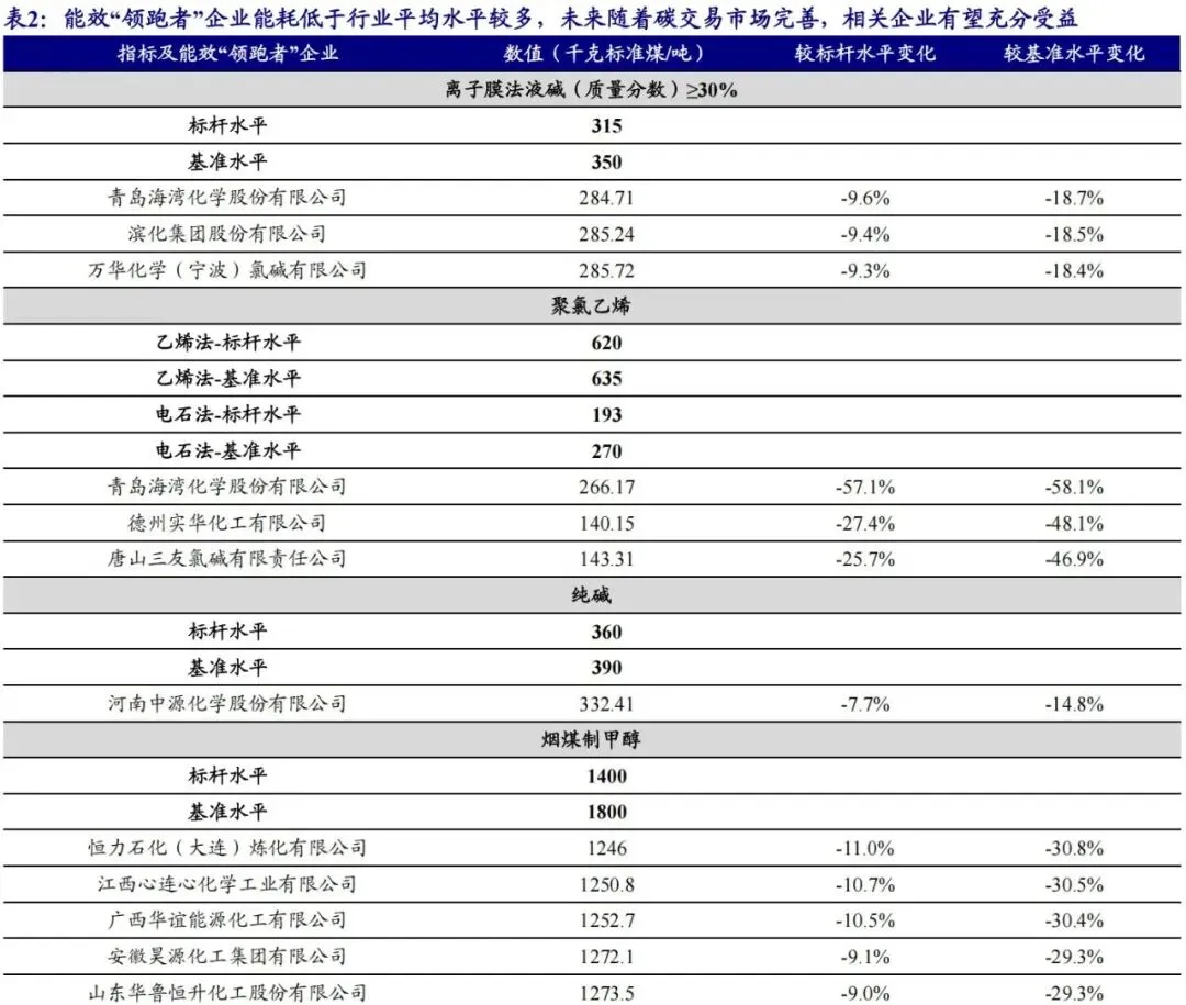 能效“领跑者”企业能耗低于行业平均水平较多,相关企业有望充分受益。化工为仅次于电力、钢铁、建材的第四大排放源,同时行业内仍然具有一定的落后产能。未来随着化工行业被纳入碳交易市场,化工行业内的供给格局将发生一定变化,能耗水平较高的企业可将多余的碳排放配额在碳交易市场中出售进而增厚效益,而能耗水平较低的企业需在碳交易市场中购买不足的碳配额进而增加成本,加快落后产能的退出。我们统计了液碱、聚氯乙烯、纯碱等6个化工子行业能效“领跑者”企业的情况,其能耗水平较行业标杆水平平均低19%、较基准水平平均低31%。即能效“领跑者”企业能耗低于行业平均水平较多,市场竞争力较强,未来随着碳交易市场完善,低能耗企业有望充分受益。