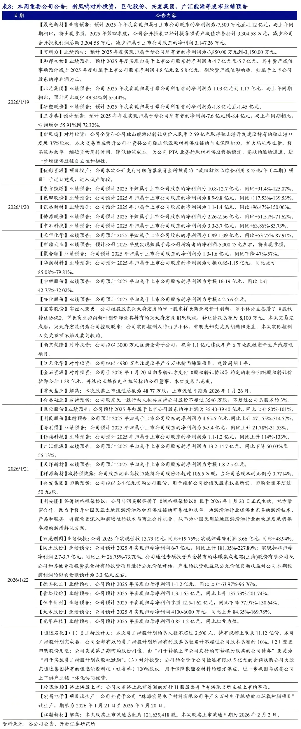 4.1、 本周重要公司公告:新凤鸣对外投资,巨化股份、兴发集团、广汇能源等发布业绩预告
