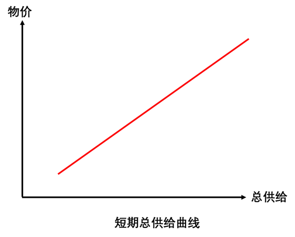 根据短期效应,总供给与物价正相关,和微观经济的供给曲线类似,是一条向上的曲线。