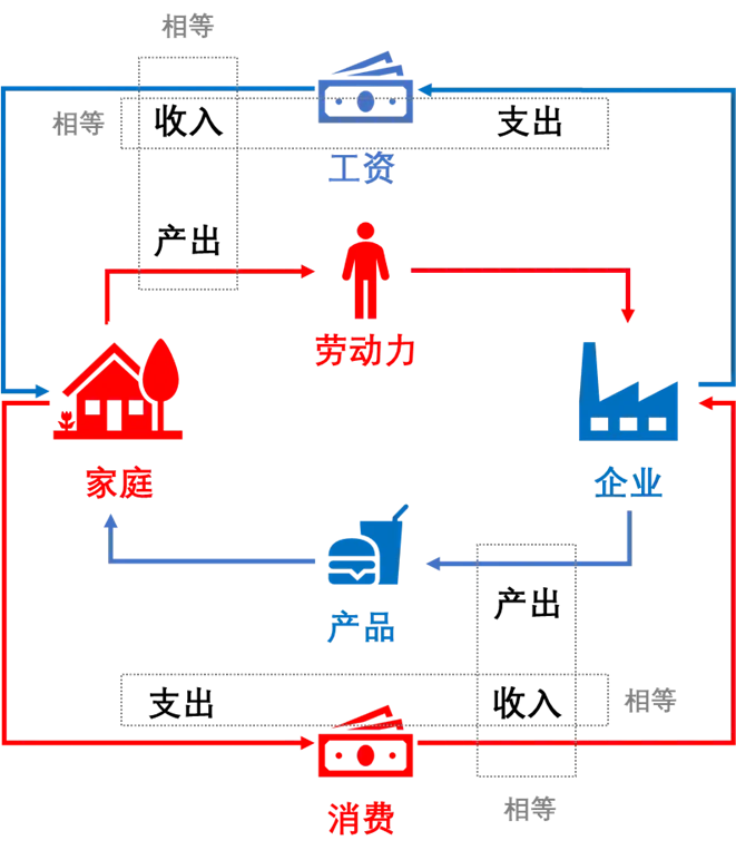 在简化的模型中,生产者可对应企业,消费者可对应家庭,家庭向企业提供劳动力(劳动力属于服务,也算产出),企业通过工资和利润等形式回馈给家庭,同时生产产品,家庭得到回馈后消费产品,如此形成循环: