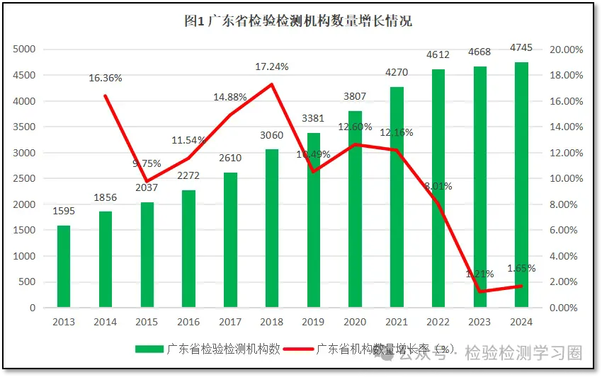 过去12年,广东省检验检测机构数量的平均增速为10.53%,比全国7.24%的年均增速高出3个多百分点,且在多数年份里增长率高于全国平均水平。2024年,广东省检验检测机构数量增长率出现一定的止跌回升现象,有可能意味着我国区域差异化发展的态势进一步加剧,总体行业紧缩但个别区域仍然扩张的现象将会更加明显。