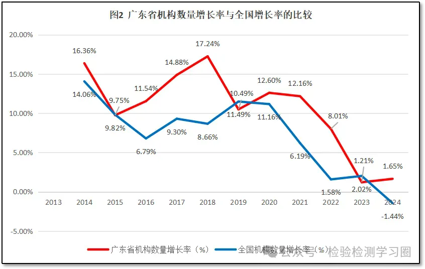广东省检验检测机构数量增长率与全国检验检测机构数量的增长率进行比较,如图2所示。