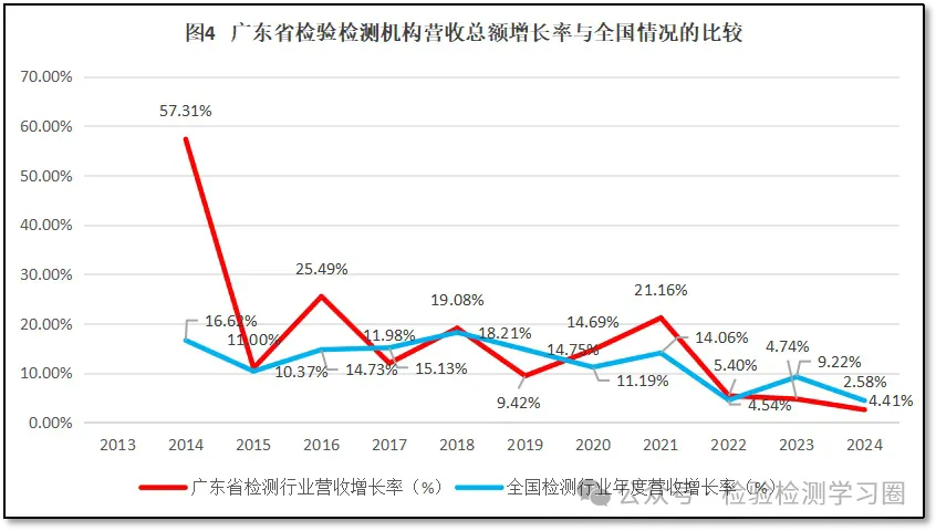 比较广东省检验检测行业年度营收总额增长率与全国检验检测行业年度营收总额增长率,如图4所示。