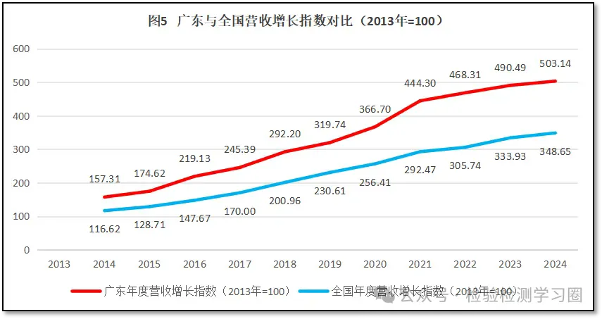 由上图可见,广东省检验检测行业营收增长指数保持了持续较快增长,且远高于全国平均数,最近几年与全国平均数的差距越拉越大,2024年度的增长指数比全国平均数高出超过150,显示出极强的增长实力和发展后劲。