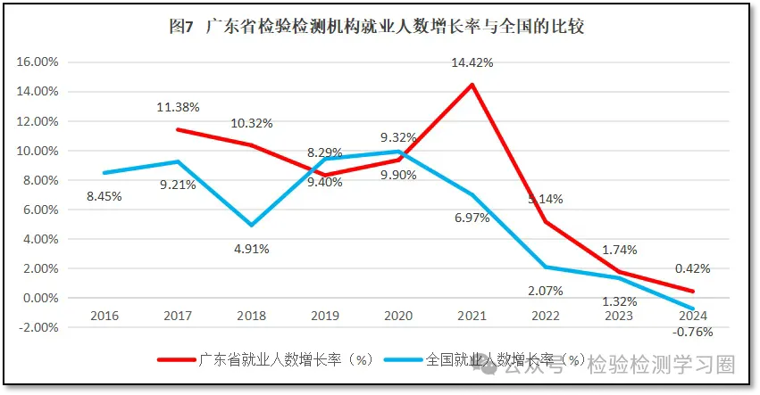 由图7可见,在2020年全国检验检测行业就业人口开始进入下降区间后,广东省检验检测行业就业人数在2021年还迎来了一个高峰期,到2022年度才开始下降,跟广东省检验检测机构数量增长率的变化规律类似,在时间上具有一定“滞后性”。而广东省检验检测行业就业人数增长率曲线最近几年虽然持续下降,但仍略高于全国平均水平,2024年还保持了正增长。
