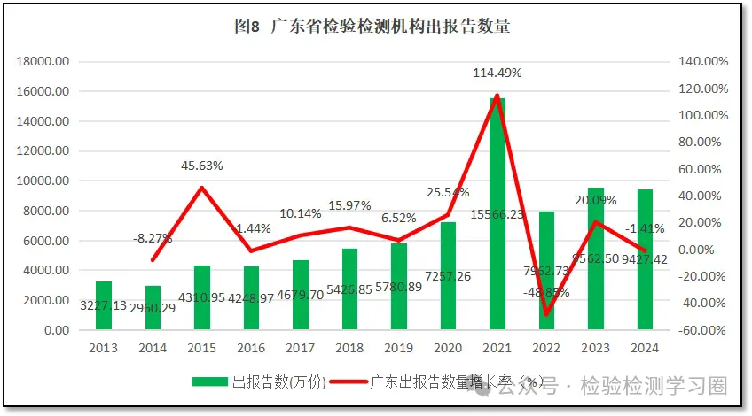 从图8来看,广东省检验检测机构年度对外出具检验检测报告数量总体来说呈现逐年增长的趋势,但在2021年有一个异常增长,当年出具报告数量达到1.56亿份之多,增长率达到114.49%,但次年数据回落到较为合理的区间。2024年度出具报告的数量为9427.42万份,是2013年度数量的2.92倍,较2023年度略有下降。