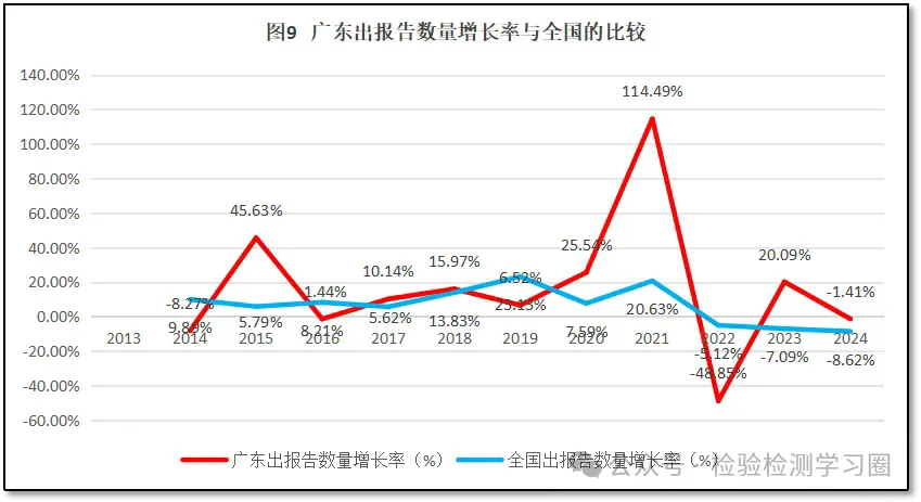 广东省检验检测机构出具报告数量的增长率与全国的比较如图9所示。