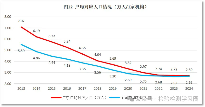 再来看广东地区检验检测机构户均对应服务的人口数据。2024年末,广东省常住人口1.278亿人,检验检测机构户均服务人口2.69万人,与全国平均数2.65万人进一步接近。过去12年,广东省检验检测机构户均对应的人口数量与全国的情况进行比较,如图12所示。
