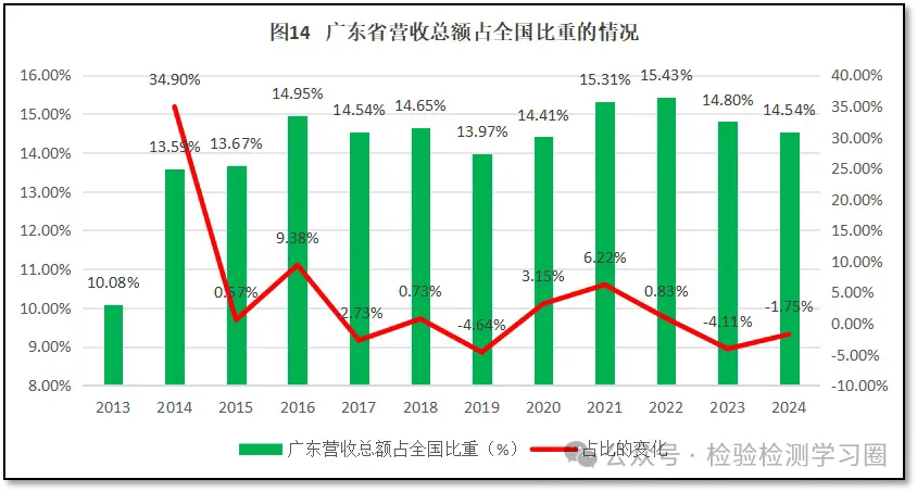 由图14可见,除了第一年数据偏小之外,从2014年起,广东省检验检测机构营收总额在全国检验检测行业营收总额中占比总体较为稳定,保持在14%-16%之间波动。这一占比的同比增长率从2015年起波动起伏不大,各年有正有负,最近10年的平均年度增幅仅0.76%左右。这一方面说明广东地区检验检测机构盈利能力强,在机构数量占全国比重约为8.94%的情况下创造了营收总额占全国比重约14.5%的成绩,虽然最近三年占比有所下降,但仍保持在14%以上;另一方面也说明,广东省检验检测行业做出的贡献一直较为稳定,发展的步伐跟全国发展的步调相当一致,没有出现明显的超前或者滞后现象。