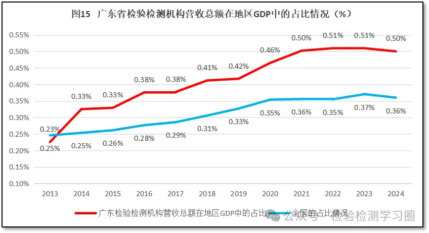 再来看广东省检验检测机构营收总额在其地区生产总值GDP中的占比情况。2024年度,广东省检验检测机构营收总额708.97亿元,占当年广东省GDP值的0.50%,远高于全国平均值0.36%,排名全国第4(按照由高到低排序)。过去12年广东省检验检测机构营收总额在当地GDP值的比例变化情况如图15所示。
