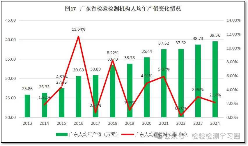 人均年产值是衡量检验检测机构经营运行质量的直观指标。2024年度,广东省检验检测机构人均年产值39.56万元,高于30万元的行业温饱线,也高于2024年度全国31.45万元的行业平均值,排名仍位于全国第5位(由高到低排序)。这表明广东地区检验检测机构总体经营状况良好,整体上保持在“小康”区间且仍处于上升期。过去12年广东省检验检测机构人均年产值的变化情况如图17所示。