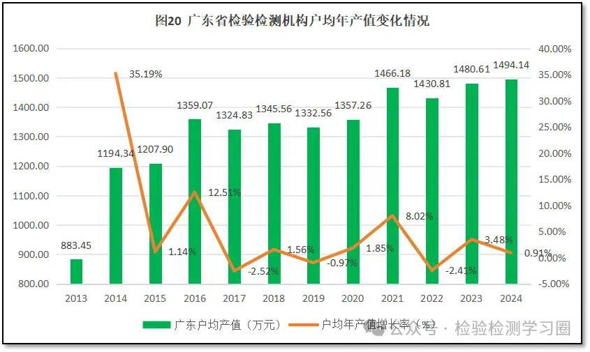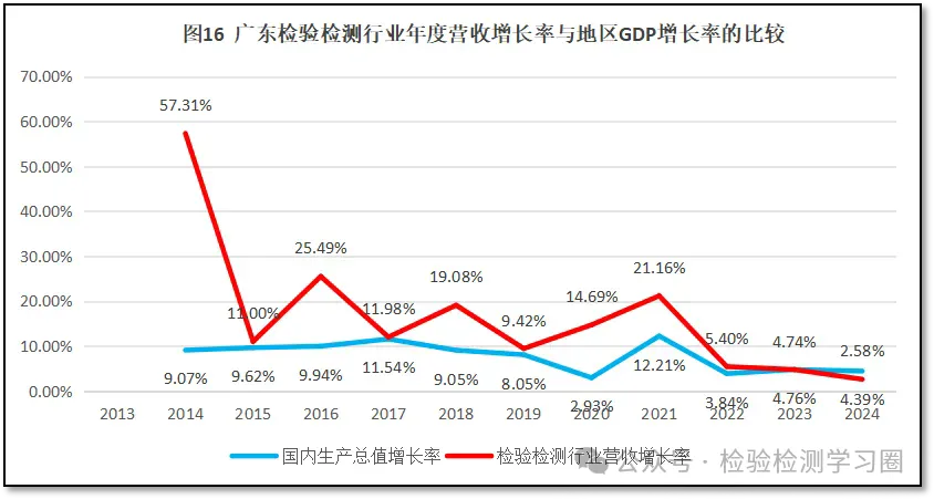 由图16可见,刨除第一年数据误差较大之外,从2015年起,广东省检验检测机构年度营收总额增长曲线始终在广东省GDP年度增长曲线之上波动,并逐步契合同频。这一方面说明广东省检验检测机构早期发展速度较快,呈现出比当地GDP增幅更高的增长率;另一方面也说明,随着时间的推移,广东省检验检测市场的成熟度不断提高,广东省检验检测机构营收总额的增长变化律动与广东省宏观经济发展指标日益同频,变化规律趋于一致。不过,2024年,广东省检验检测机构营收增长率低于当地GDP增长率,说明检验检测行业发展速度慢于区域经济发展速度,已经落后于市场发展的需要。