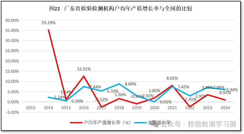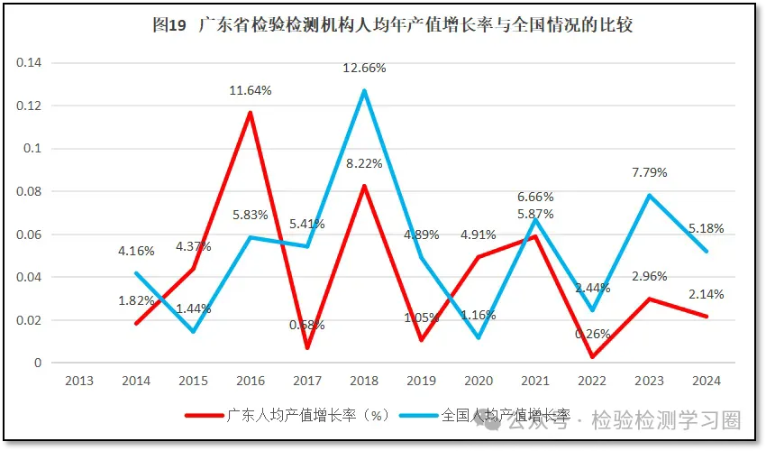 再来看广东省检验检测机构人均年产值增长率与全国人均年产值增长率的比较,如图19所示。