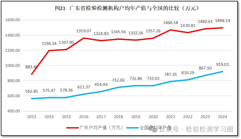 由图23可见,广东省检验检测机构户均出报告数量均高于全国平均水平,说明广东省检验检测机构承接的业务量很大(2021年广东省检验检测机构户均出具报告数量出现一个异常高值,可能存在数据误差)。