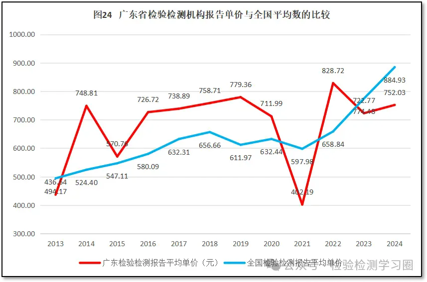 由图24可见,全国检验检测机构出具的检验检测报告单价总体保持较为平稳的增长,但广东省检验检测机构出具的检验检测报告单价在总体保持增长的同时存在几次大幅度的波动,最近几年在全国平均线附近波动,2023、2024连续两年已经低于全国平均水平,排名全国第23位,再一次下降。可以看到,由于广东省检验检测机构数量多,竞争激烈,市场成熟,价格透明度很高,且低价竞争现象较为普遍,导致检验检测报告单价居于全国中等偏下水平。