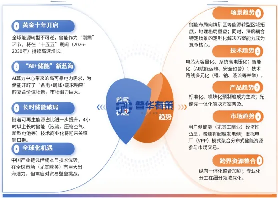 北京普华有策信息咨询有限公司《“十五五”储能产业深度研究及趋势前景预判报告》系统剖析了全球储能行业全景。首先定义了行业并梳理其从示范到规模化的历程,结合“十四五”以来的关键政策分析驱动环境。报告深入产业链上下游,揭示原材料、技术进步与下游电力市场、AI数据中心等新需求如何塑造行业。通过波特五力、SWOT模型及对宁德时代、阳光电源等龙头企业的深度剖析,呈现激烈竞争格局。核心章节预测了2026-2030年市场规模与结构,明确指出“AI+储能”、长时技术、用户侧经济性等核心机遇,并研判技术迭代、产品形态及商业模式发展趋势。最后,报告总结了投资机遇、潜在风险,并为参与者提供策略建议。