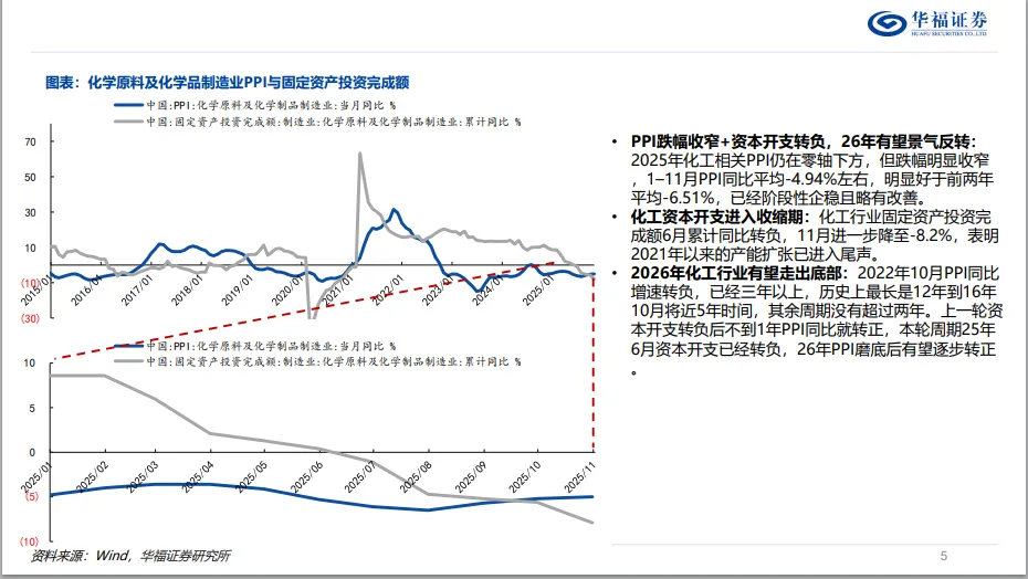 周期维度:资本开支回落,龙头白马有望率先修复。化工行业资本开支高峰已过,202年下半年行业固定资产投资转负,标志着产能扩张周期逐步结束。随着未来PPI逐步转正,行业供需拐点将至。在此背景下,万华化学作为聚氨酯龙头,随着自身资本开支逐步收缩及全球MDI产能占比的提高,盈利中枢有望稳步上移;华峰化学由于规模优势形成的低成本护城河,是兼具安全边际与业绩弹性的行业龙头,