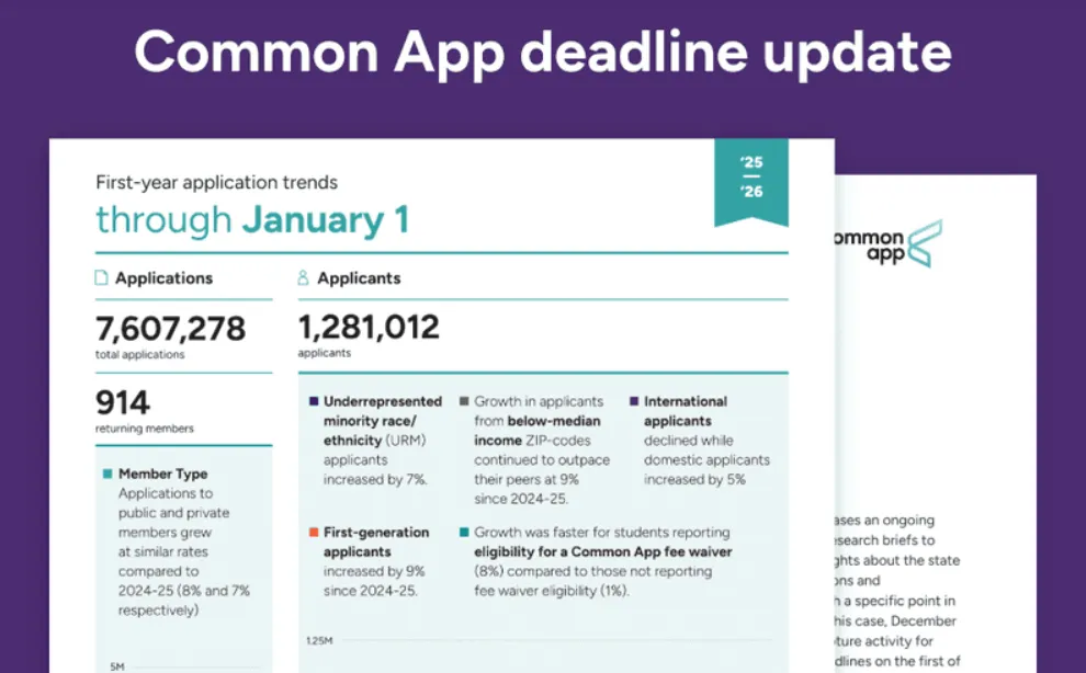 近日,Common Application(简称CA)发布了2026Fall(2025年申请季)最新申请数据报告,这份涵盖全球1,000多所高校的申请数据,揭示了未来申请季的关键变化与趋势。