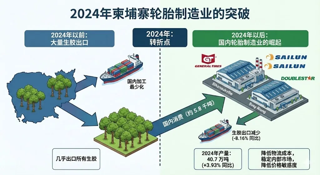 产业链下游的突破:轮胎制造业的崛起 2024年是柬埔寨橡胶产业的转折之年。长期以来,柬埔寨几乎将全部原胶出口,缺乏国内加工能力。然而,随着中国轮胎企业为规避欧美对华反倾销关税而采取“出海”战略,柬埔寨成为了理想的投资目的地。 通用轮胎(General Tires)、赛轮轮胎(Sailun)和双星轮胎等中国巨头纷纷在柬埔寨西哈努克港、柴桢省等地设立大型工厂。数据显示,2024年柬埔寨橡胶产量达到40.7万吨,同比增长3.93%,但生胶出口量却同比下降了8.16%。这一数据的背离揭示了一个关键趋势:国内轮胎厂已经开始大规模消化本土产能(约5.8万吨)。这种“地产地销”模式不仅减少了物流成本,还为柬埔寨橡胶提供了稳定的内部市场,降低了对国际现货市场价格波动的敏感度 6。