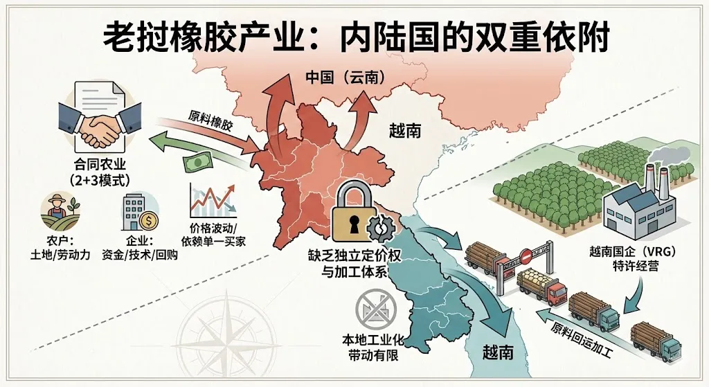 老挝作为内陆国,其橡胶产业表现出对邻国市场(尤其是中国和越南)的极度依附性,且国内缺乏独立的定价权和加工体系。