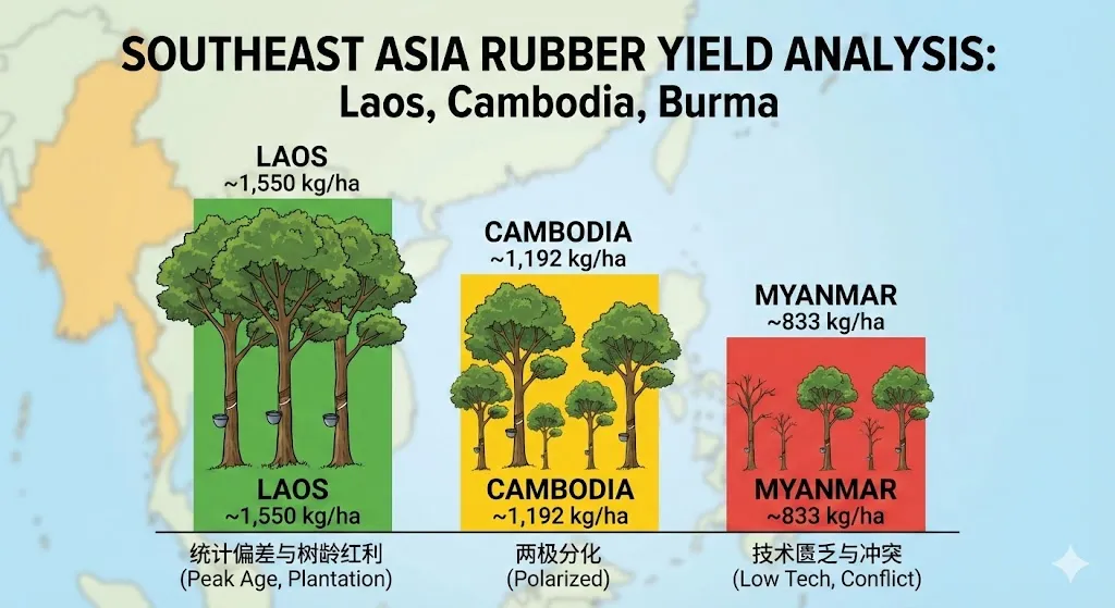 研究发现,在生产与增长动力方面,三国呈现出截然不同的路径依赖:柬埔寨正通过引入中国轮胎制造业资本,迅速从原料出口国转型为轮胎制造基地,从而在内部消化产能并规避部分贸易壁垒;老挝则形成了“北中小农户合同制、南大种植园特许制”的双轨格局,高度依赖中国市场;缅甸虽然拥有巨大的土地潜力和约164万英亩的种植面积,但受困于2021年政变后的政治动荡,导致正规贸易体系崩塌,高达数十亿美元的“影子贸易”流向中国,且因为投入品(如化肥)短缺导致单产潜力受限。