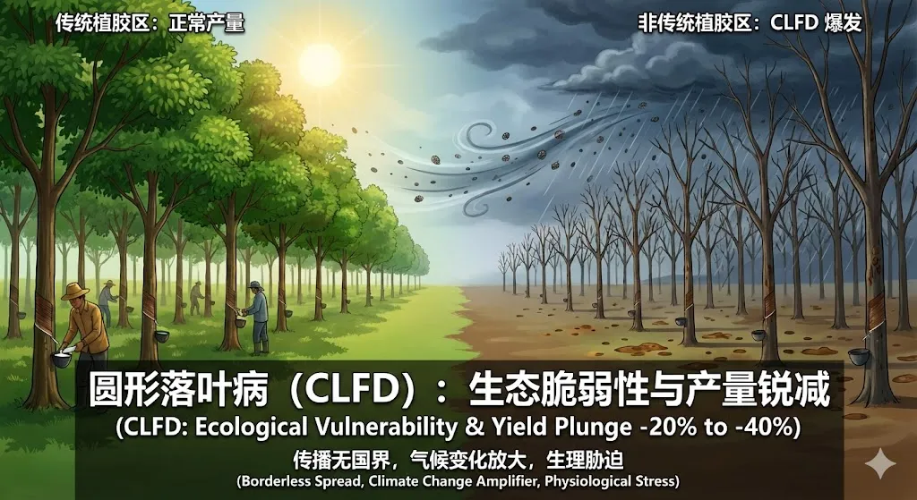 圆形落叶病(CLFD) 的爆发揭示了非传统植胶区的生态脆弱性。该病会导致橡胶树叶片在非落叶季节脱落,使得树木不得不消耗储存的能量重新长叶,导致胶乳产量下降20%-40%,严重时甚至导致树木死亡。