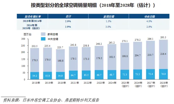近年来,全球空调市场呈稳定增长趋势,销量由2018年的232.5百万台增至2024年的261.2百万台,复合年增长率为2.0%2024年家用空调占市场总规模的73.7%,表现稳定。此外,中央空调销量加快增长,尤其是于新兴市场,2018年至2024年的复合年增长率为4.0%。受发达国家和地区及中国的置换需求以及新兴市场的新需求推动,全球空调市场预计维持稳定增长。2028年全球空调销量预计达293.3百万台,2024年至2028年的复合年增长率为2.9%,中央空调的销量增速预计将继续快于家用空调。下图说明全球空调销量的增长情况及按类型划分的明细。
