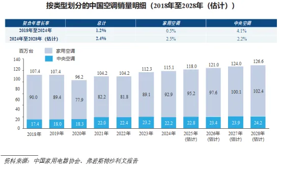 近年来,中国空调市场呈稳定增长态势。中国空调销量由2018年的107.4百万台增至2024年的115.1百万台,复合年增长率为1.2%,预计2028年将达126.6百万台,2024年至2028年的复合年增长率为2.4%。受稳定的置换需求、下沉市场渗透提升及政府鼓励设备更新等因素驱动,中国空调销售预计继续增长。
