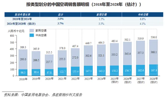 受新兴市场中央空调增长以及不同地区的需求不断增加等各项因素推动,以销售额计,全球空调市场于过往数年持续增长。以销售额计,空调的全球市场规模由2018年的人民币10,186亿元增至2024年的人民币13,128亿元,复合年增长率为4.3%,预计2028年将达人民币15,332亿元,2024年至2028年的复合年增长率为4.0%。其中,以销售额计,家用空调的全球市场规模由2018年的人民币6,368亿元增至2024年的人民币7,853亿元,复合年增长率为3.6%,而以销售额计,中央空调的全球市场规模增长则更为强劲,由2018年的人民币3,818亿元增至2024年的人民币5,275亿元,复合年增长率为5.5%