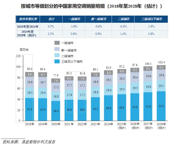 三线及以下城市为中国家用空调的最大市场。2024年该等地区的家用空调销售占中国家用空调总销量的50.4%,主要由于该等下沉市场拥有大量人口且空调的市场渗透率相对较低,带来不断增长的强劲需求。中国三线及以下城市的空调销量由2018年的41.9百万台增加至2024年的46.8百万台,复合年增长率为1.9%,远高于行业整体复合年增长率0.5%。未来,在可支配收入水平及城市化率不断提升、置换销售及以旧换新需求不断增加等因素的推动下,中国三线及以下城市家用空调市场预计保持稳定增长。预计2028年中国三线及以下城市的空调销量将达54.3百万台,自2024年起的复合年增长率为3.8%