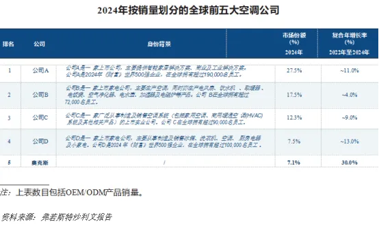 2024年,全球空调行业的市场参与者数量超过100家。按销量划分前五大空调公司如下: