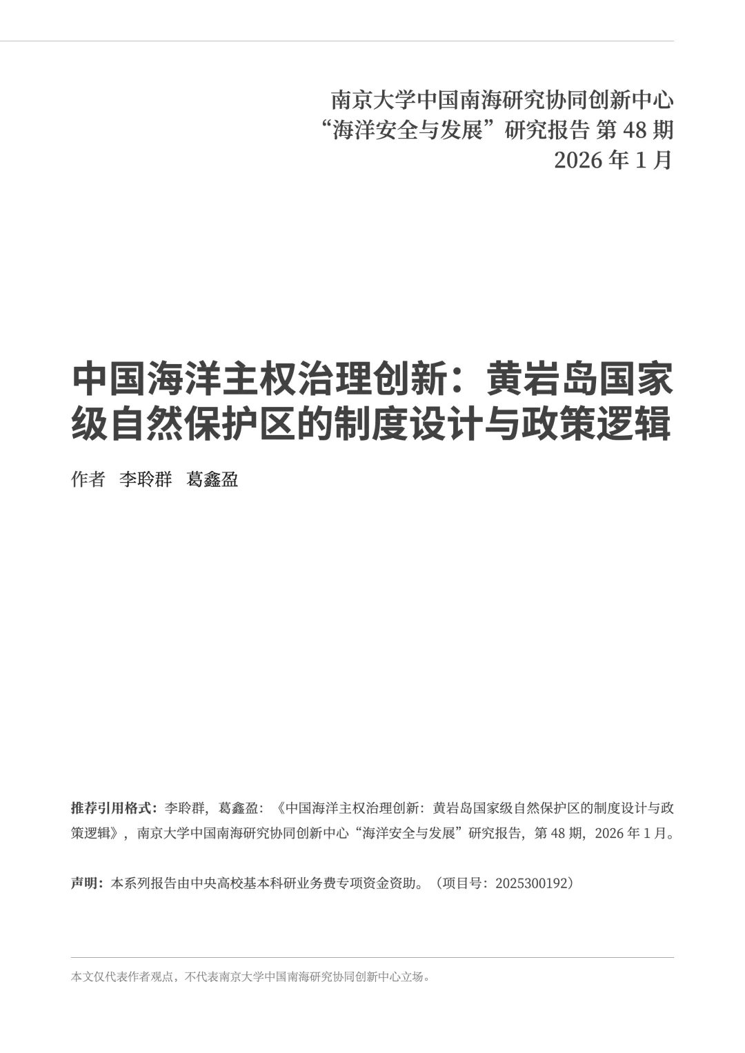 【研究报告】李聆群 葛鑫盈:中国海洋主权治理创新:黄岩岛国家级自然保护区的制度设计与政策逻辑 | 南大南海中心