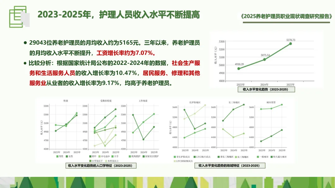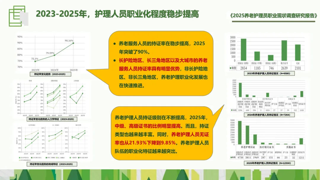 伴随银发经济加速崛起,我国养老护理员队伍建设稳步推进,职业化专业化水平持续提升,但行业仍面临供需矛盾与结构性转型压力。2025年护理员持证率突破90%,月均收入达5165元,职业状态整体趋于稳定,长护险试点地区在队伍留存、待遇保障上的优势尤为明显。与此同时,收入增速滞后、机构护理人员身心健康堪忧、技能培训供需错位等问题依然突出,叠加2025至2030年照护需求激增的态势,行业亟需依托政策完善、科技赋能与市场激活实现高质量发展。