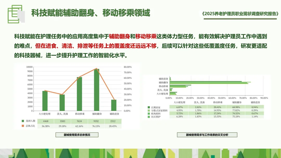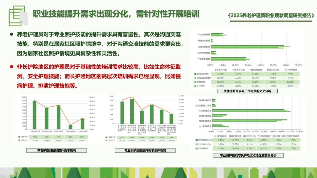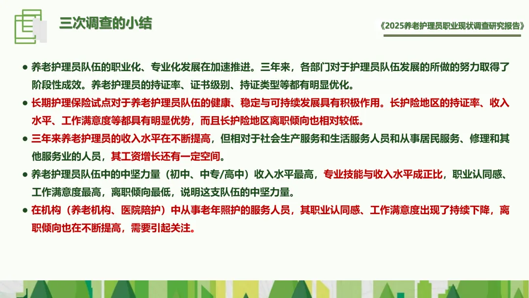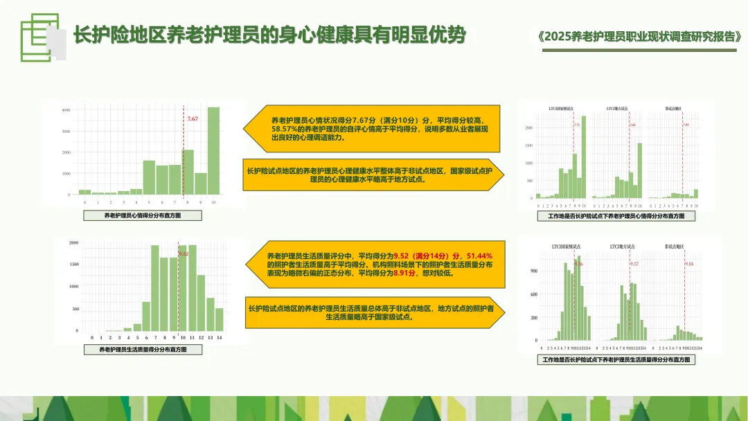作为应对人口老龄化的重要制度安排,长护险试点为行业发展注入强劲动力。不仅有效稳定从业人员队伍,国家级试点地区因赡养冲突离职的比例远低于地方试点及非试点区域,更提升了护理员待遇水平与职业认同感,规范了服务模式,让合理工时占比提升,从业人员身心健康状况改善。未来需推动长护险从试点向全面建制过渡,扩大制度覆盖范围,将薪酬保障、职业支持等成熟经验向全国推广。强化政策协同,推动长护险与技能培训、机构运营、科技赋能深度融合,针对试点地区显现的高层次技能需求配套专项培训。同时优化保障机制,缓解护理员家庭照护压力,进一步降低赡养冲突对队伍留存的影响,助力织密失能人员保障网。