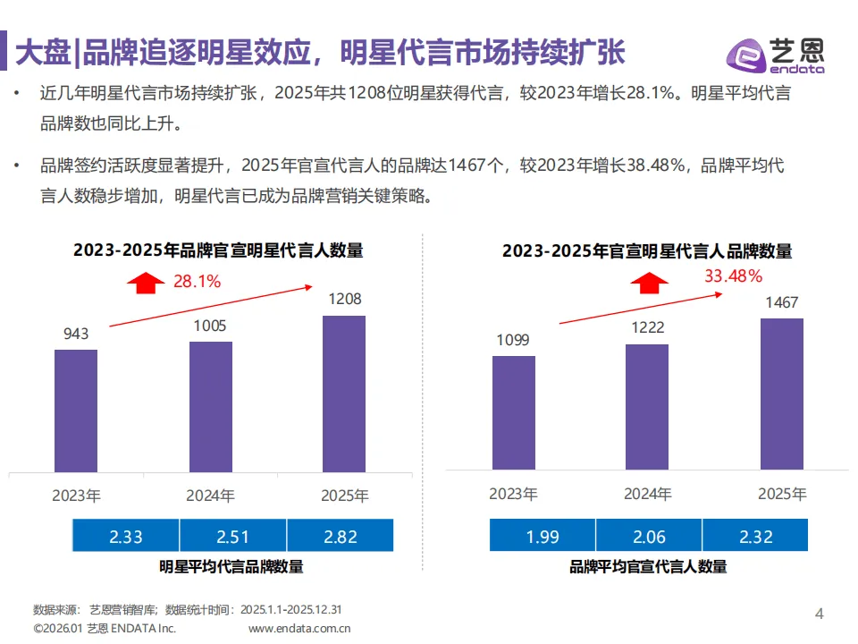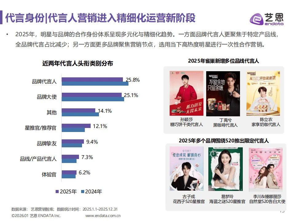 2025年明星营销市场持续扩张,1208位明星获得代言,官宣品牌达1467个,均较2023年显著增长,代言官宣集中在5月、9-10月以适配电商大促节奏。圈层方面,娱乐影视明星占据绝对主导,喜剧类艺人代言增长最快,体育明星代言数量下降但合作向长效化、多元化发展。行业分布上,美妆护肤代言量居首,交通出行行业增速领先,电商平台竞争升级,淘宝、天猫以“核心基石+高频矩阵”模式领跑,抖音生活&电商入局后代言人数量同比上涨155%。艺人结构上,男性、26-35岁中青年艺人为主,代言资源向中腰部(B、C类)倾斜,合作模式精细化,节点短期营销成主流。社媒营销形成全链路布局,微博打造大事件、抖音短直联动+短剧营销实现转化、小红书场景化种草沉淀口碑,同时涌现代言人周边创新、用户共创、AIGC赋能等新玩法,营销更注重情感共鸣与长尾效应。