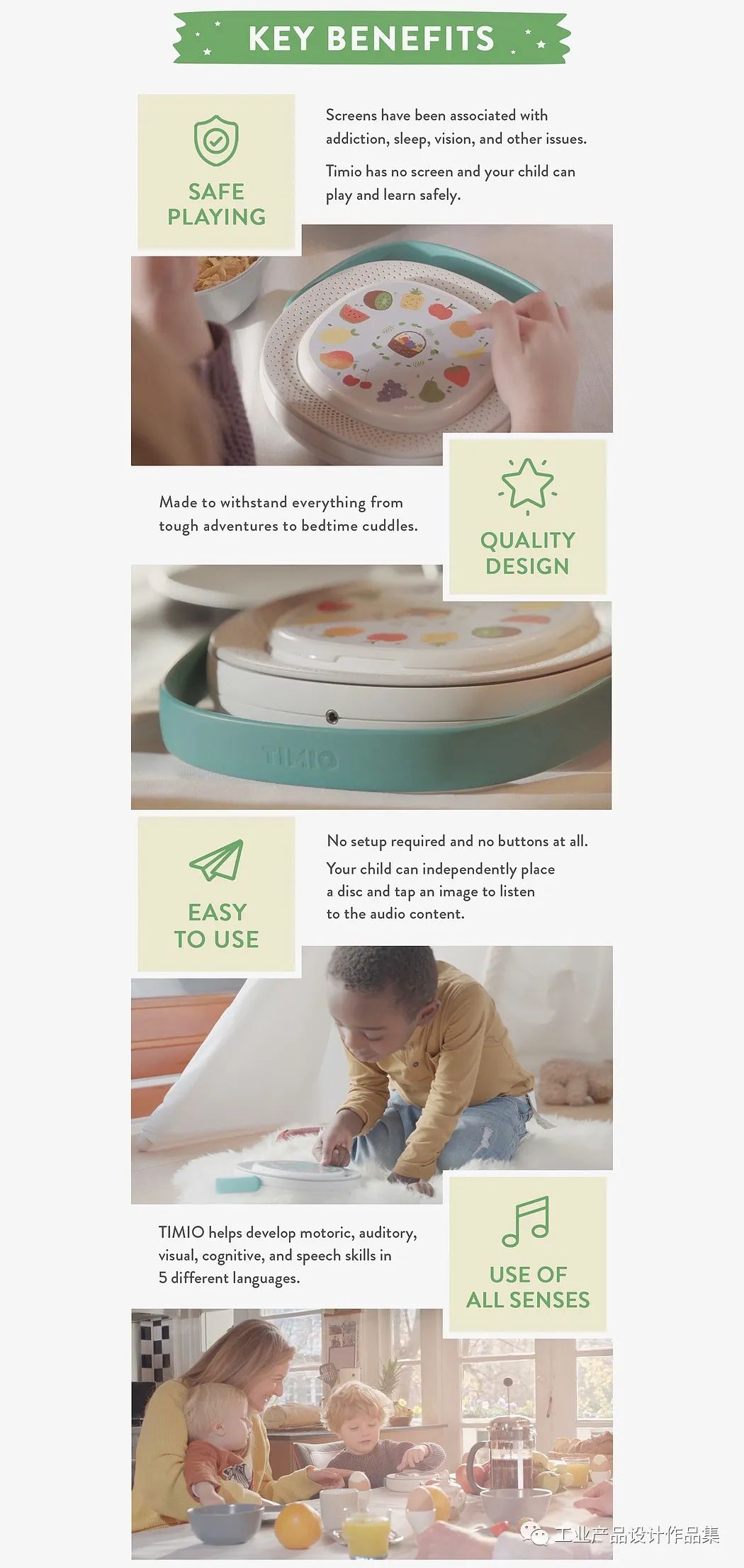 TIMIO作为一个教育音频和音乐播放器,使用磁盘解锁精选内容库,包括童谣、摇篮曲、童话和词汇,共有5种不同的语言:英语,西班牙语,法语,德语和荷兰语,适合在多语言环境下成长的孩子。