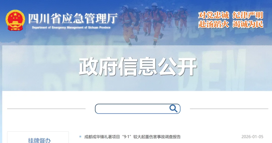 2025年9月1日10时左右,成都市成华区万年场街道槐树店路16号臻礼著项目发生一起较大起重伤害事故,造成5人死亡,直接经济损失1363.16万元。事故发生后,省委、省政府高度重视,派出工作组现场指导事故救援工作,并由省政府牵头成立事故调查组,对事故实行提级调查。有关纪检监察机关按照干部管理权限,依规依纪依法对12名公职人员进行了严肃追责问责,公安机关对涉嫌违法犯罪的4名涉案人员进行立案侦查。