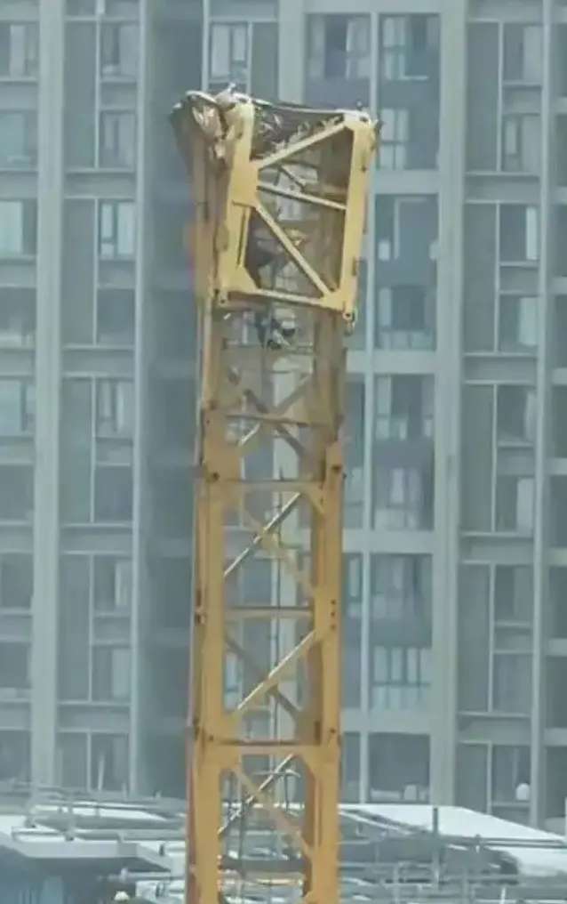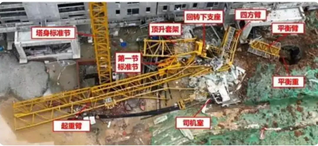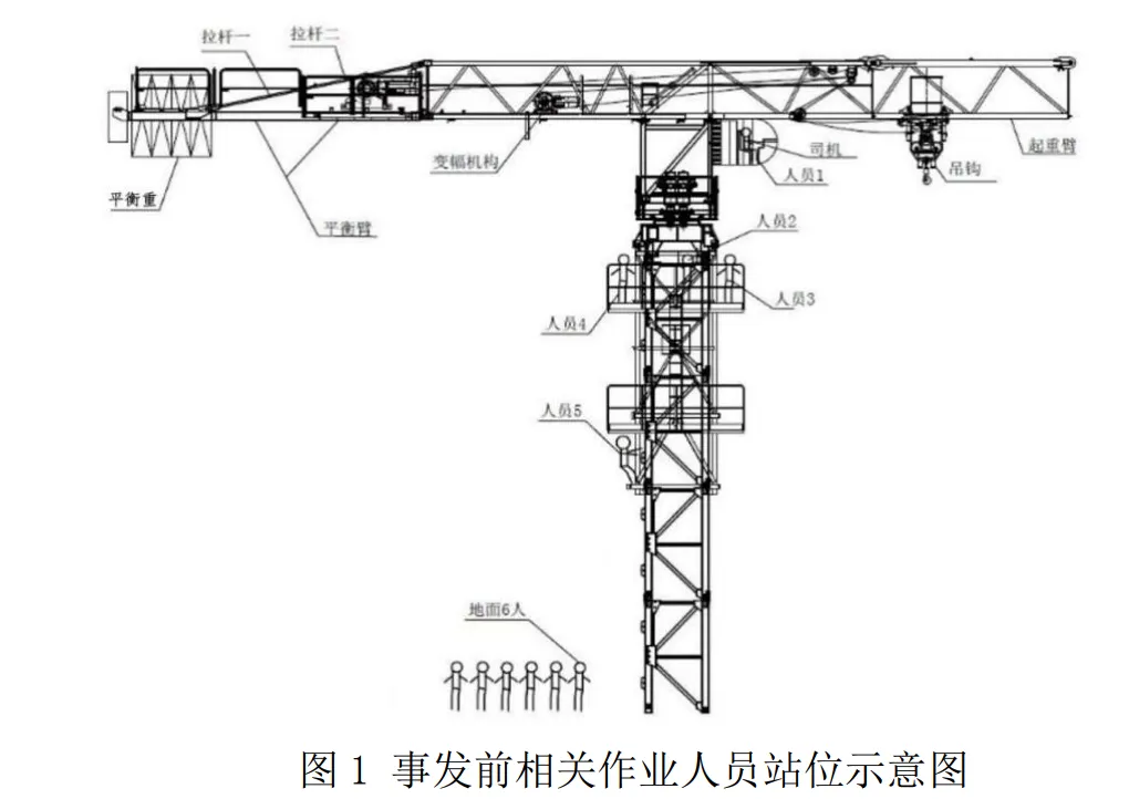 10 时 1 分 49 秒至 54 秒,起重臂开始向下坠落,带动平衡臂翻过塔身连同第一节标准节、顶升套架、回转总成及以上部分向着起重臂方向坠落到地面。4 名作业人员坠落地面被困,1 名作业人员卡在塔身上部被困。