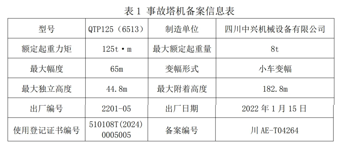 (4)四川中兴机械制造有限公司(以下简称中兴公司), 塔机制造单位。公司类型:有限责任公司(自然人投资或控股), 注册时间:2006 年 4 月 17 日,注册资本:4000 万元,注册地址: 成都市郫都区成都现代工业港南片区,法定代表人:黄梦,统一 社会信用代码:91510124788106483Y。经营范围:建筑工程用机械制造等。2018 年 12 月 5 日,取得《中华人民共和国特种设 备制造许可证(起重机械)》,编号:TS2410B21-2022,级别:A 级,品种:普通塔式起重机(限 QTZ 型 315t.m 及以下、QTPQ型 315t.m 及以下、QTD 型 200t.m 及以下),有效期至 2022 年12 月 4 日;2022 年 12 月 23 日,延续换领《中华人民共和国特 种设备生产许可证(起重机械)》,编号:TS2451107-2026,许 可项目:起重机械制造(含安装、修理、改造),许可子项目: 塔式起重机、升降机(具体产品范围见型式试验证书),有效期 至 2026 年 12 月 22 日。