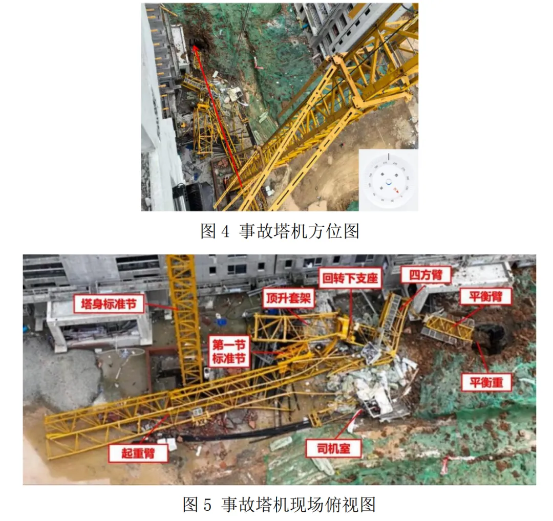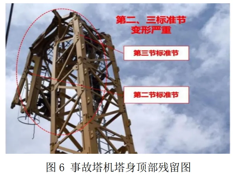 塔机位于 6#楼靠中庭一侧,从平衡臂向起重臂方向坍塌,以起重臂为基准,左手方向为左侧,右手方向为右侧。见图4。