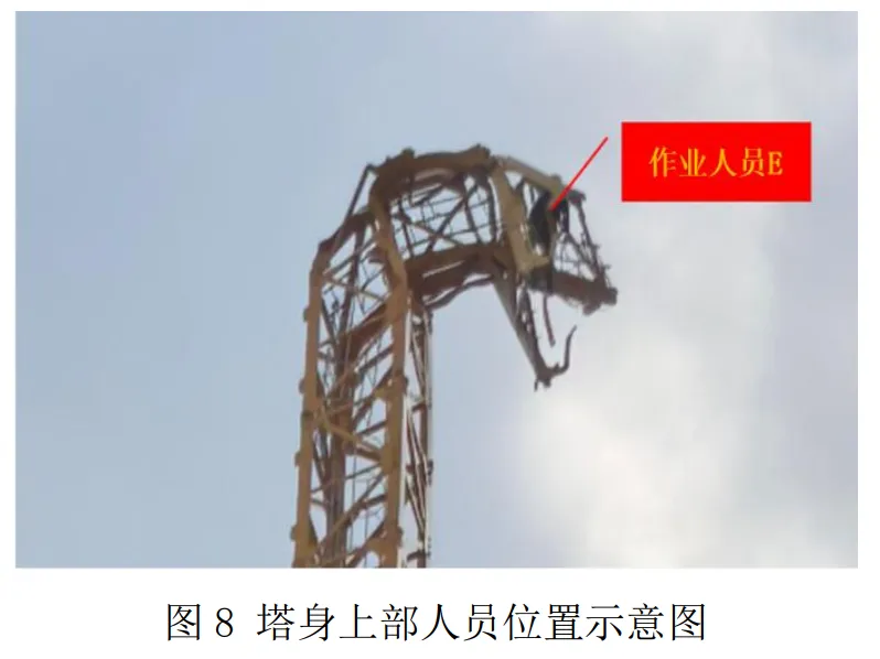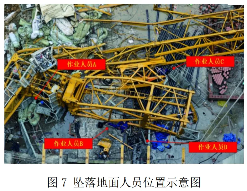 4 名作业人员坠落地面被困,分别为作业人员 A 李缔怡、作 业人员 B 胡君、作业人员 C 杨兵、作业人员 D 张洪,见图 7。1名作业人员卡在塔身上部被困,为作业人员 E 柯增顺,见图 8。