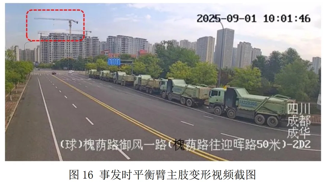 10 时 1 分 45 至 46 秒,平衡臂主肢(距离四方臂与平衡臂 铰接点 4.92 米处)发生折弯下摆。
