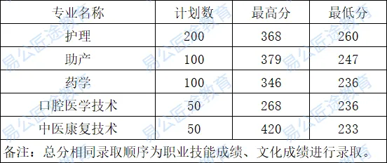 遵循“分数优先,遵循专业志愿”原则,根据考生的分数高低进行专业安排。未公布录取分数,仅在补录公告中公布康复治疗技术专业最低录取分数线221分。