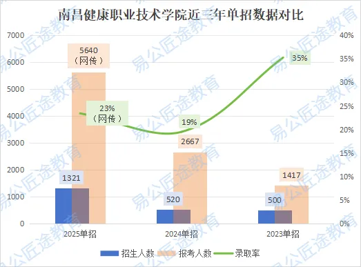 南昌健康职业技术学院近三年的单招招生人数逐年上升,25年达到了1321人;近三年录取率最高为35%、最低为19%,竞争还是比较大的。25年虽然没有公布录取分数,不过有参加过的考生说大概要270分以上。考虑到单招竞争加大的整体环境,26年想要报考该校的考生最好往300分以上努力。
