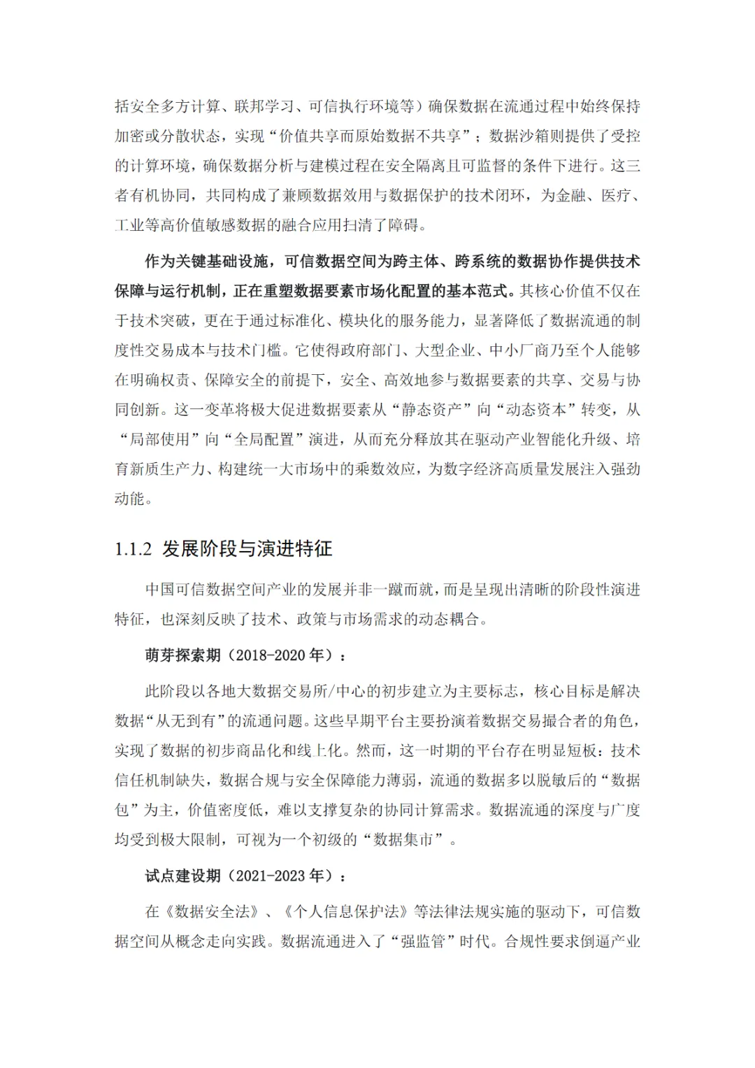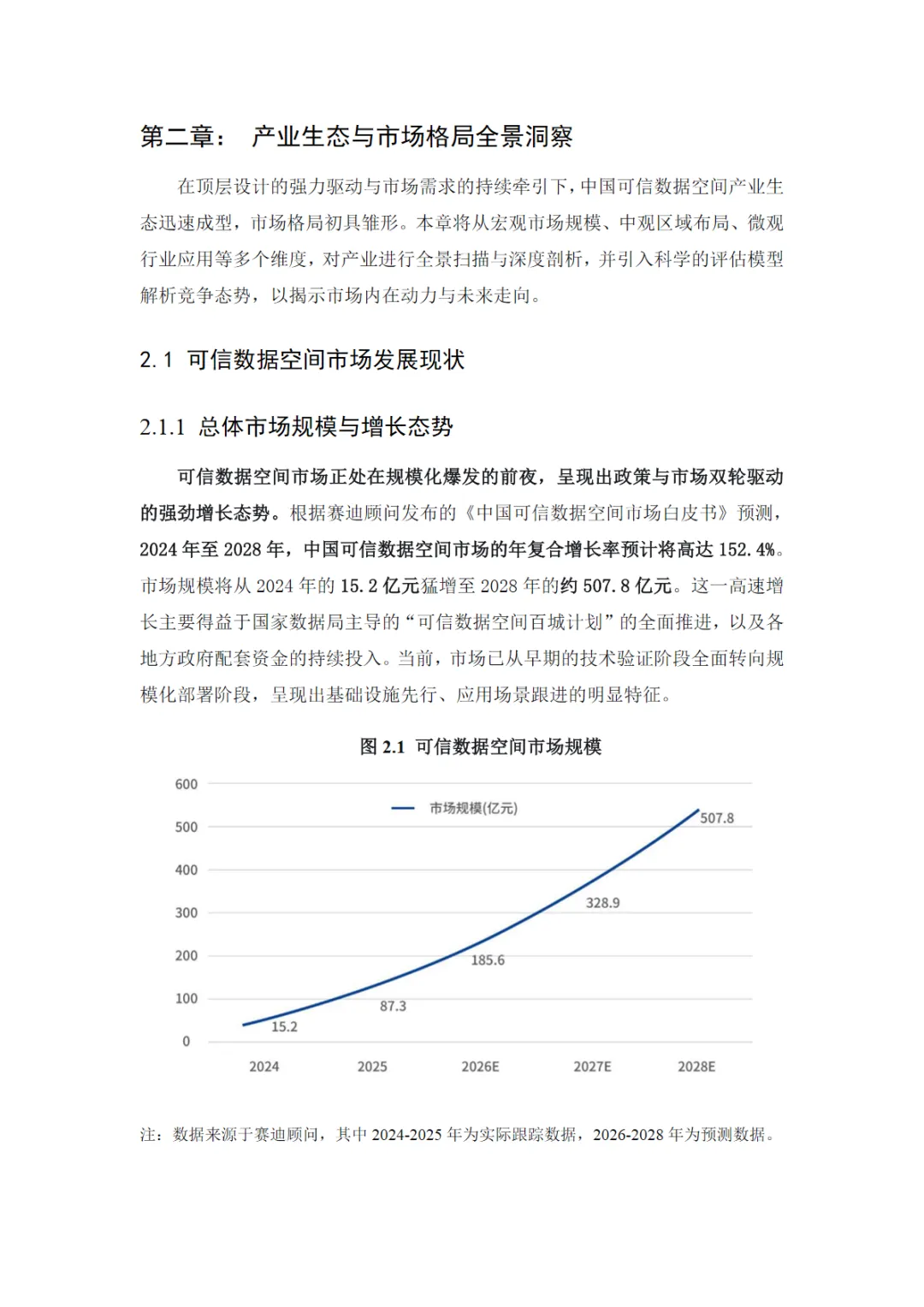 本篇行业报告可以通过扫下方知识星球下载。39元就可以下载星球所有报告。免费提供报告查找服务。在数字化时代,数据已成为国家竞争力的核心。可信数据空间,作为数据流通利用的基础设施,正在重塑数据流通范式,为释放数据要素价值奠定信任基石。随着技术的进步和政策的支持,中国可信数据空间市场正处在规模化爆发的前夜,预计2024年至2028年,市场年复合增长率将高达152.4%,市场规模将从15.2亿元增长至约507.8亿元。可信数据空间的发展经历了从技术概念走向产业实践的过程。在全球数字经济竞争日趋激烈的背景下,数据的高效流通与价值释放直接关系到国家数字竞争力和产业创新活力。可信数据空间通过融合区块链、隐私计算、数据沙箱等关键技术,构建起“数据可用不可见、可控可计量”的新型数据流通环境,为金融、医疗、工业等高价值敏感数据的融合应用扫清了障碍。市场发展初期,技术产品与解决方案是市场的绝对主体,但随着首批数据空间完成基建并投入运营,运营与增值服务的占比将快速增长,标志着产业价值中心正在转移。区域发展呈现明显的梯度分布特征,长三角、粤港澳、京津冀三大城市群已成为创新策源地和产业集聚区,占据了全国市场份额的75%以上。城市数据空间作为新型智慧城市的核心基础设施,正从“建系统”向“建生态”深刻转变。全国已有89个城市启动城市级数据空间建设,其中38个城市已进入实质运营阶段。这些城市数据空间通过构建“城市大脑+数据空间”的双轮驱动架构,实现了从单纯的数据汇聚向数据价值释放的战略升级。行业数据空间建设进入深耕期,工业、金融、医疗成为行业数据空间部署的三大核心领域。企业级数据空间正成为龙头企业数字化转型的新标配,实现从“成本中心”向“价值中心”的战略转变。随着行业数据空间的深入应用,专业化运营服务市场快速兴起,推动产业从“项目建设”走向“生态培育”。总体来看,可信数据空间市场正呈现出政策与市场双轮驱动的强劲增长态势,市场结构正经历深刻演变,从早期的基础设施建设“一家独大”,转向运营服务与增值应用占比快速提升的多元格局。随着技术的进步和政策的支持,可信数据空间市场将迎来更广阔的发展空间。免责声明:以上分享报告为公开合法渠道获得,内容大部分来源于网络,版权归原作者所有,如有侵权,请及时与我们联系,我们将第一时间保障您的权益。推荐内容仅供参考学习,不构成投资建议。