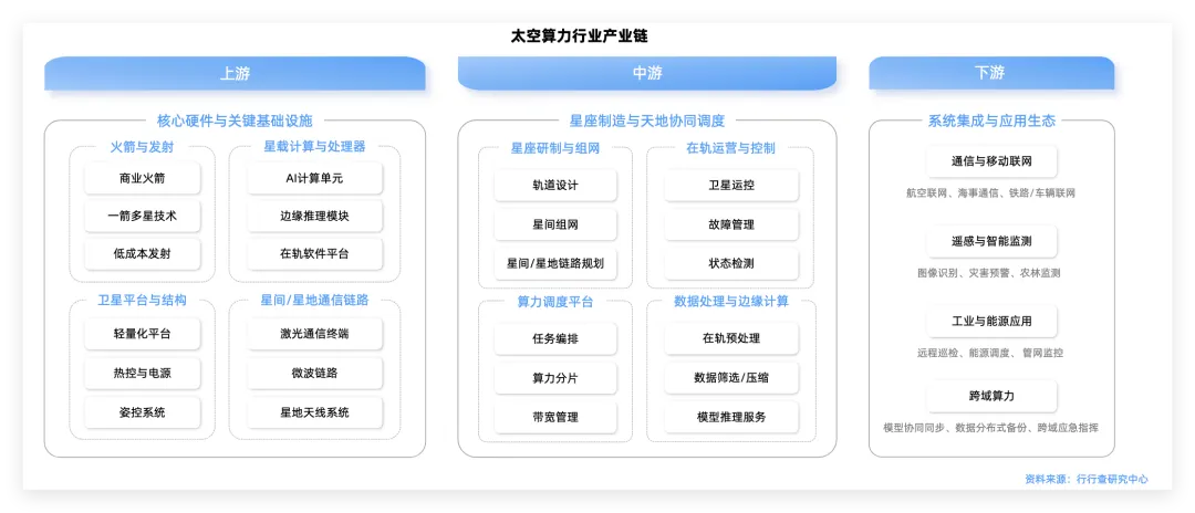 太空算力的下游是价值最终兑现层,覆盖行业应用、企业跨域算力调度、终端设备等几大核心环节。