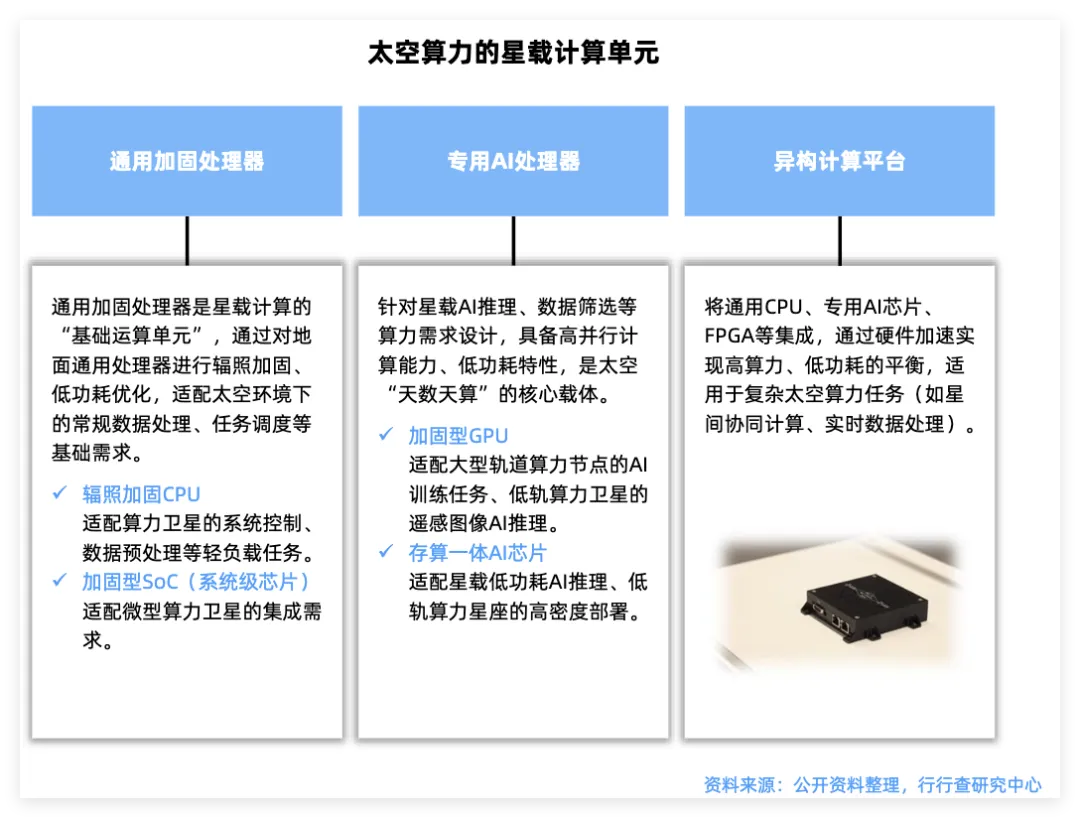 通常由高性能计算模块(如GPU、CPU、AI芯片)、能源系统(太阳能电池阵+储能装置)、散热系统(辐射散热板+热管)和通信链路(星间激光通信+星地链路)组成。